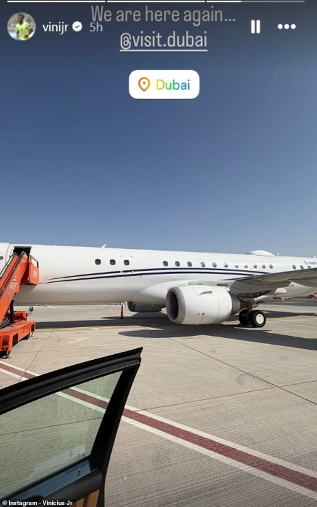 Mengunggah foto yang tampaknya merupakan pesawat pribadi di bawah sinar matahari Dubai, Vinicius menambahkan: ‘Kami kembali lagi… @visit.dubai.’