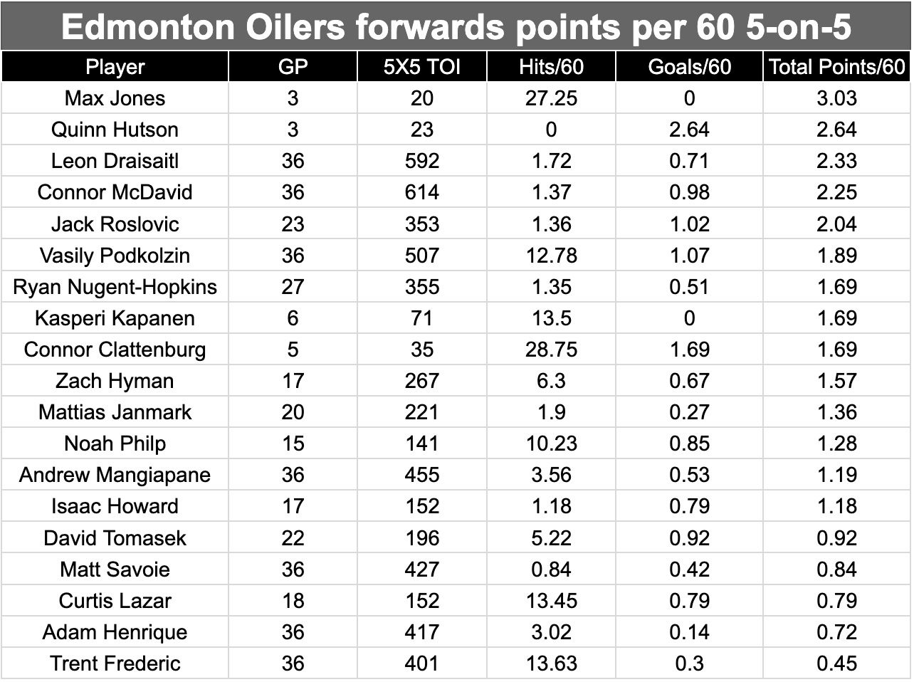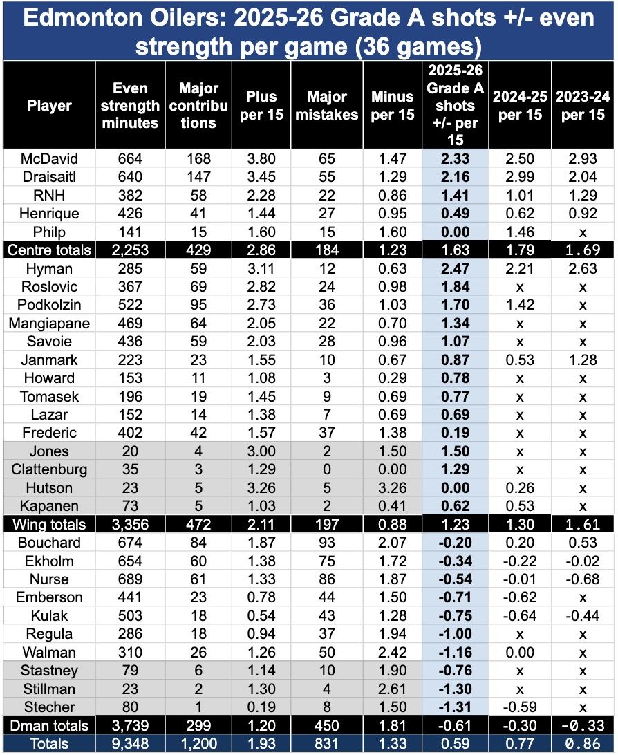 4. Dalam hal permainan bertahannya, tidak ada sayap di Oilers yang kebobolan tembakan kelas A seperti Frederic. Bahkan tidak mendekati. Dia membuat 1,38 kesalahan besar per 15 menit bermain setara. Rata-rata tim untuk sayap adalah 0,88 per 15 menit.