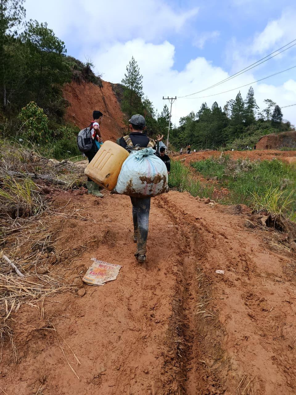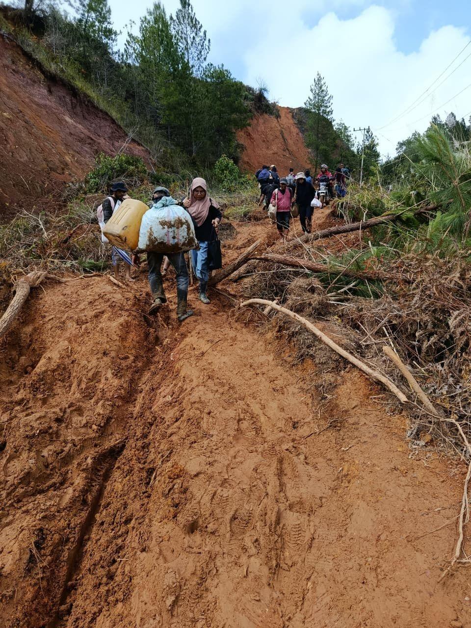 “Kami mesti berjalan menggendong beras, minyak, melewati longsoran karena stok logistik tidak ada lagi. Kalau akses jalan tidak dibuka, akan membuat kami kelaparan sangat panjang,” ujarnya dari ujung telepon yang jaringannya timbul-tenggelam.